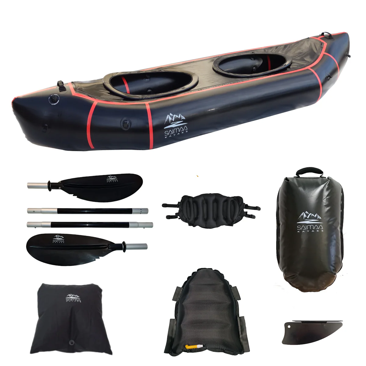Saimaa Kayaksin Adventure Twin XL on iso ja tilava kahden hengen packraft mukavuutta arvostaville retkeilijöille. Packraft sopii myös pidemmille melojille (180cm+) sekä pitkille matkoille extra ison sisätilan (215cm) ja pitkän vesilinjan (350cm) ansiosta, mikä tekee siitä suuntavakaan. Suuntavakautta lisää vielä irroitettava evä, joten tällä packraftillä on ilo tehdä useamman päivän pitkiäkin retkiä kaksin. Hieman tavallista leveämpi profiili (99cm) tuo vakautta ja tilaa lauttaan. Tavaraa kulkee mukana vetoketjullisen ponttoonitaskun sisällä sekä irroitettavan YKK-vetoketjullisen kansipeitteen alla. Packraftin mukaan kuuluu kaksi päällepuettavaa aukkopeitettä, joilla roiskevedet pysyy ulkona. Paketissa myös vesitiivis kantosäkki packraftille, joka toimii meloessa myös suojana muille tavaroille. Kantosäkissä on mainiot kiinnitysmahdollisuudet sekä packraftiin, että rinkkaan, pyörään tms packraftiä kannettaessa. (Huom! kantosäkki kuvasta poiketen vihreä).