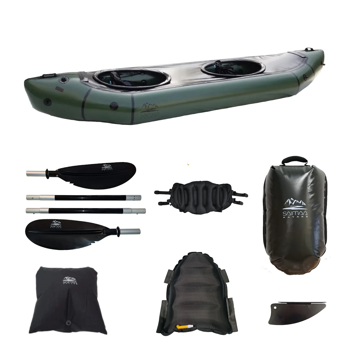 Saimaa Kayaksin Adventure Twin XXL on malliston isoin ponttoonitaskulla varustettu retki-packraft kaksikko, johon mahtuu helposti pitkätkin melojat (+185cm) ja säilytystilaa on yllin kyllin. Adventure Twin XXL Packraftissä on pituutensa (380cm) ansiosta erinomainen suuntavakaus, mitä irroitettava evä vielä auttaa, joten pidemmätkin matkat taittuvat mukavasti. Hieman tavallista leveämpi profiili (99cm) tuo vakautta ja tilaa lauttaan. Tavaraa kulkee mukana vetoketjullisen ponttoonitaskun sisällä sekä irroitettavan kansipeitteen alla vaikka kuukauden retkelle. Packraftin mukaan kuuluu YKK-vetoketjullinen kansipeite sekä kaksi päällepuettavaa aukkopeitettä, joilla roiskevedet pysyy ulkona. Jos tarvitset maksimaalista tavaran kuljetuskapasiteettiä ja/tai pitkille melojille mukavuutta melontaan, XXL on oiva valinta.